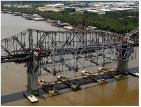 Sebagai bagian dari proyek bersejarah pelebaran jembatan, dua bagian rangka baja jembatan sepanjang 528 kaki dan seberat 2700 ton dibangun di darat, diangkut menggunakan tongkang, lalu diangkat secara bersamaan setinggi 130 kaki untuk dipasang pada Jembatan Huey P. Long di New Orleans.