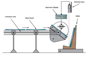 Sensor Laser Jarak Dimetix mengukur tinggi palet dan menyesuaikan posisi untuk menghentikan panel kaca. Setelah panel berhenti, mesin mulai memiringkannya dengan presisi ke palet pada titik di mana kaca tidak akan tergelincir atau salah posisi. Panel kaca kemudian ditempatkan dengan hati-hati di atas palet, berdampingan dengan panel kaca lainnya.