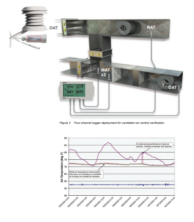 Gambar 2 menunjukkan unit penanganan udara (air handler) khas di sebuah gedung di wilayah Midwest selama bulan Agustus. Kinerja unit penanganan udara di gedung ini dipantau dengan menggunakan satu alat pencatat suhu/kelembapan untuk merekam kondisi udara luar secara umum, serta satu alat pencatat data empat saluran dengan probe suhu eksternal. Pengukuran suhu udara balik (Return Air Temperature/RAT), suhu udara keluaran (Discharge Air Temperature/DAT), dan dua suhu udara campuran (Mixed Air Temperature/MAT) — yang mensimulasikan rata-rata suhu udara campuran — diperoleh menggunakan beberapa probe suhu dengan panjang berbeda yang terhubung ke alat pencatat data empat saluran tersebut.