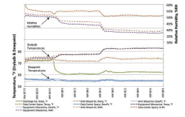 Data logger HOBO dipasang di lokasi strategis sepanjang jalur aliran udara untuk mengukur kondisi termal udara. Lokasi pemantauan meliputi plenum udara suplai, ruang pusat data (tempat peralatan server menambah panas pada aliran udara), tingkat mezzanine (di mana unit distribusi daya atau PDU menambah panas), dan bagian udara campuran sebelum udara dikondisikan kembali melalui koil air dingin RTU.