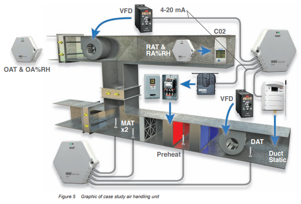 Studi kasus yang kami sajikan menggunakan data logger dan data tren dari Sistem Otomasi Bangunan (Building Automated System/BAS). Namun, data logger dan berbagai perangkat plug-in yang tersedia dapat digunakan secara luas dalam aplikasi analisis, seperti yang ditunjukkan pada Gambar 5. Gambar tersebut memperlihatkan sistem air handler yang dipantau secara menyeluruh, termasuk pengukuran suhu, kelembapan, CO2, tekanan statis saluran, output analog VFD menggunakan kabel 4-20 mA, dan amperase CT.