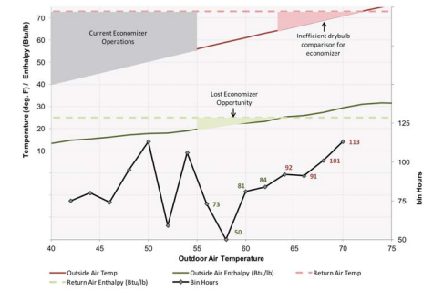Grafik juga mengungkap bahwa kontrol ekonomizer berdasarkan perbandingan suhu drybulb udara luar dan udara balik akan menyebabkan operasi ekonomizer yang tidak efisien. Hal ini dikarenakan entalpi udara luar pada rentang suhu 63-72°F lebih tinggi daripada entalpi udara balik.