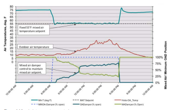 Gambar 8 menunjukkan katup udara campuran ekonomizer mengatur suhu udara campuran agar tetap pada setpoint 55°F. Selama periode pemantauan ini, suhu udara luar berkisar antara 10°F hingga 30°F.