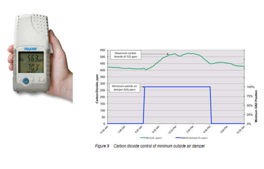 Dengan dikombinasikan kontrol suhu udara campuran tetap pada 55°F dan katup udara luar minimum yang terbuka penuh, praktik ini menyebabkan suhu udara campuran yang terlalu dingin dan tingkat udara segar yang berlebihan, terlihat dari kadar CO2 yang relatif rendah.