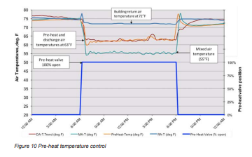 Meskipun investigasi ini dilakukan pada mode pemanasan, kami dapat mengambil beberapa kesimpulan terkait mode pendinginan, yang ironisnya terlihat dari operasi katup pra-pemanas. Grafik pada Gambar 10 menunjukkan bahwa saat katup air dingin tertutup dan katup pra-pemanas terbuka penuh, suhu udara keluaran yang terukur berkisar antara 62-65ºF dengan suhu udara campuran tetap 55°F.