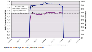 Gambar 11 menunjukkan kontrol kecepatan kipas suplai untuk mempertahankan setpoint tekanan statis saluran udara yang tetap. Data tren ini diambil saat suhu udara luar dingin dengan kecepatan VFD beroperasi pada kisaran 90-100%. Kondisi operasi seperti ini umum ditemukan pada sebagian besar unit penanganan udara gedung.