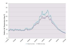 Dalam studi kasus ini, beberapa proses kontrol utama—seperti pengaktifan katup air dingin, katup pemanas awal, dan operasi ekonomizer—bergantung pada pengukuran suhu udara luar. Untuk memastikan akurasi pengukuran, sensor suhu nirkabel yang sudah dikalibrasi dipasang dekat dengan sensor suhu udara luar di sistem manajemen bangunan (BMS). Setelah pencatatan selama 24 jam, ditemukan bahwa pembacaan sensor BMS menyimpang hingga 20% dibandingkan dengan sensor nirkabel yang telah dikalibrasi. Temuan ini menegaskan pentingnya kalibrasi sensor secara rutin agar kontrol HVAC berjalan akurat dan efisien.