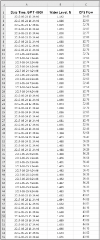 Hasilnya, kami dapat membuat spreadsheet yang menunjukkan tinggi air di flume, weir, atau bagian kanal yang telah dikalibrasi, kemudian menambahkan rumus untuk menghitung laju aliran dalam satuan CFS (cubic feet per second).