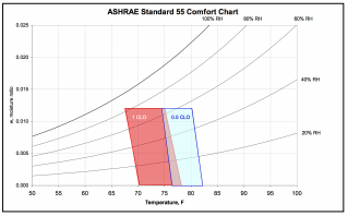 Menurut Standar ASHRAE 55, suhu antara 71°F hingga 78°F (sekitar 22°C – 26°C) pada kondisi sangat kering dapat memberikan kenyamanan bagi 80% populasi yang tidak aktif (sedentary) dan mengenakan pakaian dengan nilai 1 clo. Namun, jika kelembapan relatif naik menjadi 70% hingga 80%, rentang suhu yang nyaman turun menjadi 68°F hingga 75°F (sekitar 20°C – 24°C).