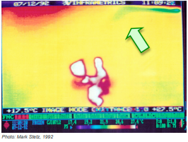 Dalam gambar termal di bawah ini, udara dingin bersuhu 45°F keluar dari slot diffuser di pojok kanan atas dan mengalir di sepanjang langit-langit. Namun, kecepatan aliran udara tidak cukup kuat untuk menjaga udara tetap di langit-langit (terlihat sebagai pita hijau).