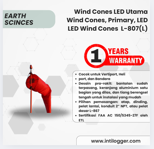 Wind Cone LED Utama memberikan informasi visual mengenai arah dan kecepatan angin permukaan kepada pilot, baik saat di udara maupun di darat, di bandara maupun heliport. Dirancang non-frangible (tidak mudah pecah), alat ini tersedia dalam dua varian: berlampu (lighted) dan tanpa lampu (unlighted), serta dua ukuran windsock: 8 kaki dan 12 kaki.