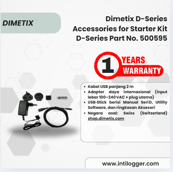 “Starter Kit Seri D Dimetix – paket lengkap aksesoris: kabel USB 2 m, adaptor daya global, dan USB‑Stick berisi manual & software. Sensor dijual terpisah.”