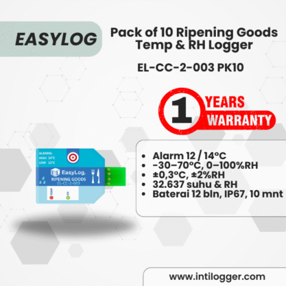 Data logger sekali pakai ini cocok untuk memantau suhu dan kelembaban selama pematangan buah atau produk sejenis. Tersedia dalam paket isi 10, alat ini dilengkapi alarm suhu, LED indikator, tahan air IP67, dan data bisa diunduh lewat USB menggunakan software EasyLog CC. Ideal untuk distribusi dan penyimpanan produk matang.