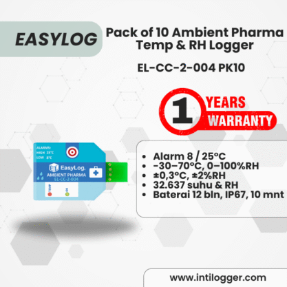 Data logger EL-CC-2-004 PK10 untuk barang farmasi suhu ruang memiliki alarm suhu tinggi 25°C dan rendah 8°C, dengan rentang pengukuran -30 hingga +70°C dan 0 hingga 100% RH. Akurasinya ±0,3°C dan ±2% RH, mampu menyimpan 32.637 data suhu dan kelembaban. Interval pencatatan setiap 10 menit, dapat merekam hingga 220 hari. Baterai tahan minimal 12 bulan, dan alat dilengkapi perlindungan IP67 tahan air dan debu.