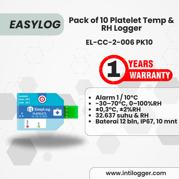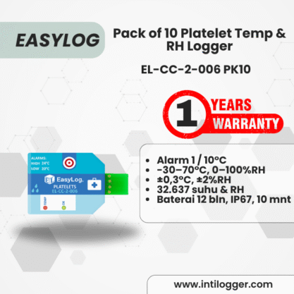 Data logger sekali pakai ini untuk memantau suhu dan kelembaban penyimpanan platelet. Paket isi 10 unit, dilengkapi alarm suhu, LED indikator, dan tahan air IP67. Data bisa diunduh lewat USB dengan software EasyLog CC.