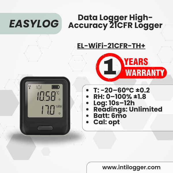 EL-WIFI-21CFR-TH+ adalah data logger suhu, kelembaban, dan titik embun berakurasi tinggi dengan koneksi WiFi. Alat ini memantau suhu -20 hingga +60°C dan kelembaban 0 hingga 100% RH, serta mengirim data langsung ke EasyLog 21CFR Cloud tanpa perlu disambungkan ke komputer. Jika WiFi terputus, data tetap disimpan dan akan diunggah otomatis saat koneksi kembali.