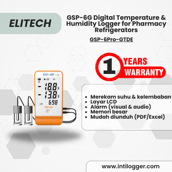 Elitech GSP-6G TDE adalah data logger suhu & kelembaban digital untuk kulkas apotek dan vaksin, dengan monitor suhu akurat dan mudah digunakan.