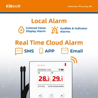 Elitech RCW-800W-TDE adalah wireless digital data logger untuk pemantauan suhu real-time dengan koneksi WiFi. Dilengkapi dual external temperature probe dengan rentang pengukuran -40 ~ 176℉ (-40 ~ 80℃), serta dukungan penyimpanan cloud gratis. Sistem peringatan dapat dikirimkan melalui SMS, Email, Aplikasi, dan Web.