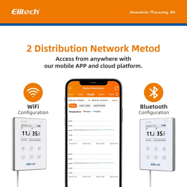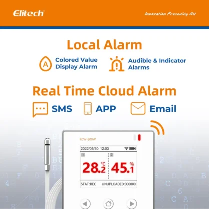 Elitech RCW-800W-THE adalah wireless digital data logger untuk pemantauan suhu & kelembapan real-time melalui WiFi. Dilengkapi probe eksternal suhu & kelembapan, penyimpanan cloud gratis, serta sistem alarm via SMS, Email, Aplikasi & Web.