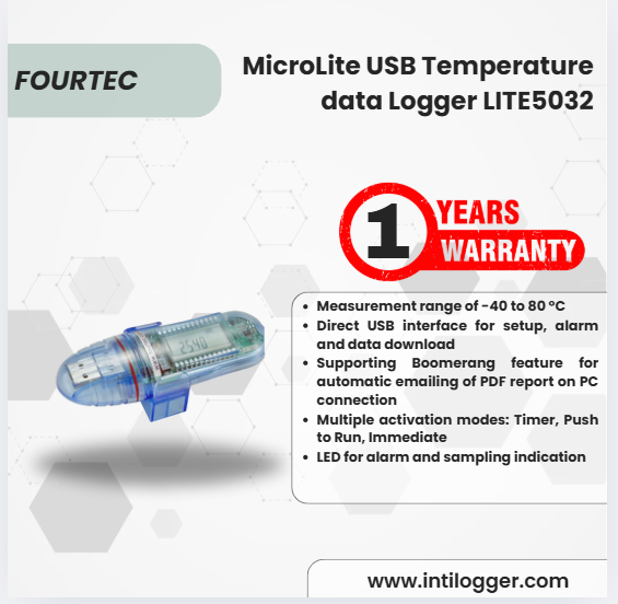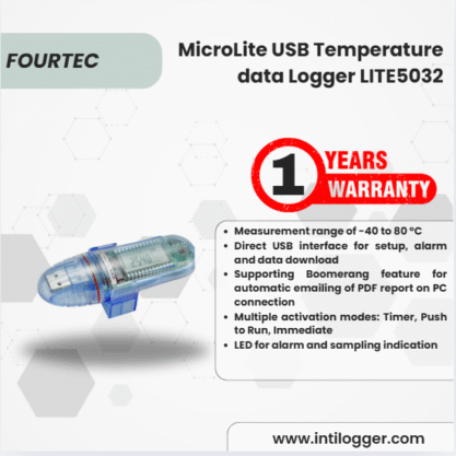 MicroLite logger mengukur suhu -40 hingga 80 °C dengan akurasi ±0,3 °C dan memori 32.000 sampel. Dilengkapi USB untuk pengaturan, unduh data, dan kalibrasi melalui software DataSuite. Data ditampilkan di layar LCD 4 digit dengan LED indikator. Baterai koin 3V tahan hingga 1,5 tahun. Mendukung aplikasi Android FourtecLite dan sesuai 21 CFR Part 11.