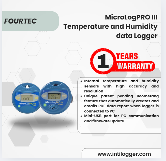 MicroLogPRO III dilengkapi sensor suhu dan kelembapan internal dengan akurasi dan resolusi tinggi, serta fitur Boomerang yang secara otomatis membuat dan mengirim laporan PDF saat logger terhubung ke PC. Port mini-USB mendukung komunikasi dan pembaruan firmware, sementara layar LCD 4 digit menampilkan data min/maks, status baterai, dan alarm. Tombol multifungsi memungkinkan penandaan waktu dan kontrol Run/Stop secara manual, didukung LED indikator untuk logging dan alarm. Logger ini juga menampilkan riwayat data min/maks hingga 30 hari, memiliki memori hingga 52.000 sampel, konsumsi daya rendah dengan daya tahan baterai hingga 2 tahun, serta tahan debu dan percikan air (IP54/NEMA 4). Didukung perangkat lunak DataSuite gratis untuk analisis dan kalibrasi, serta aplikasi FourtecLite untuk Android.
