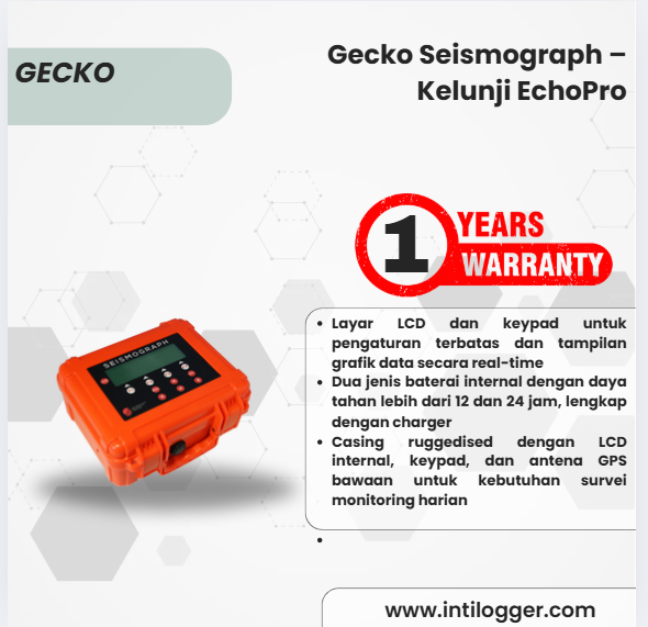 Dengan antarmuka web yang ramah pengguna, koneksi Ethernet standar, perekaman kontinu tersinkronisasi GPS ke USB, serta harga yang terjangkau, EchoPro menjadi seismograf Kelunji terlaris dalam 40 tahun sejarah kami. Dengan 6 kanal sebagai standar, EchoPro sangat ideal untuk memantau gerakan tanah lemah maupun kuat menggunakan seismometer dan akselerometer triaxial — khususnya saat dilengkapi akselerometer MEMS triaxial internal yang secara otomatis mengambil alih saat sinyal dari seismometer eksternal mengalami kliping.