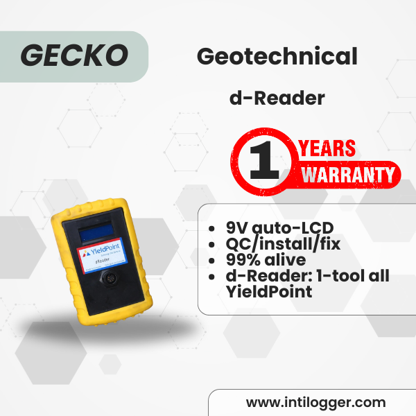 Semua instrumen geoteknik YieldPoint dapat dibaca menggunakan satu alat sederhana: d-Reader. d-Reader menggunakan baterai 9V (tidak termasuk) dan dapat bertahan selama bertahun-tahun dalam penggunaan normal. Alat ini merupakan pilihan utama untuk memverifikasi fungsi instrumen geoteknik YieldPoint Anda saat penerimaan barang, setibanya di lokasi pemasangan, sesudah instalasi, sebelum dan sesudah proses grouting, bahkan saat sesi pencatatan data sedang berjalan, apabila Anda membutuhkan pembacaan instan untuk pengecekan.