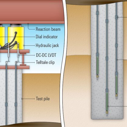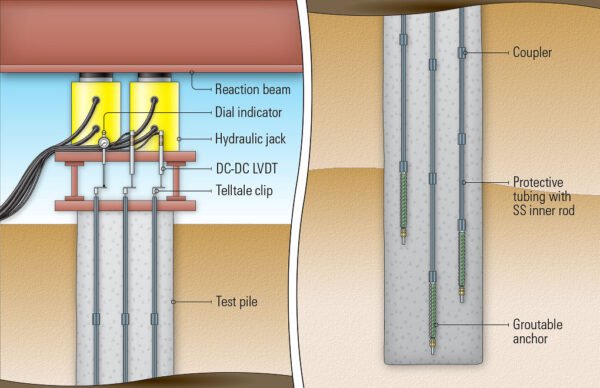 Model 1800 Telltales dirancang untuk mengukur pola distribusi atau transfer beban pada pondasi tiang (piles), tiang bor (drilled shafts), dan angkur tarik (tieback anchors). Alat ini membantu mengidentifikasi bagaimana beban diteruskan ke dalam tanah, yang sangat penting dalam analisis performa struktur pondasi dalam.