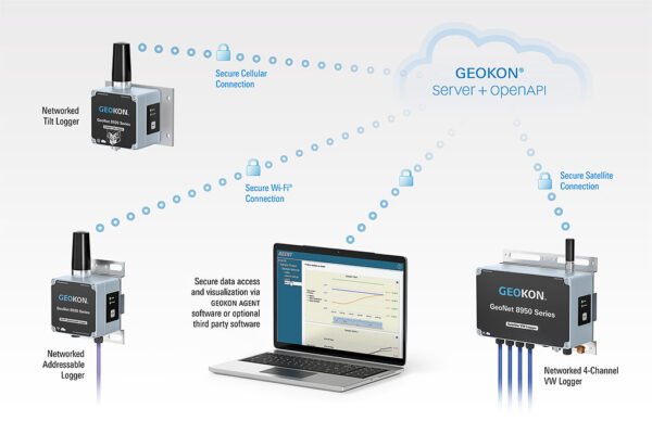 Semua data sensor dikumpulkan dan diintegrasikan secara aman ke cloud melalui Internet menggunakan GEOKON OpenAPI. API ini mudah digunakan dan memungkinkan pengguna untuk:
