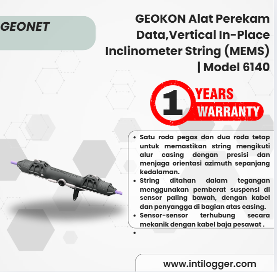 Model 6140 adalah sistem Vertical In-Place Inclinometer (IPI) yang dirancang untuk pemantauan pergerakan lateral tanah atau struktur secara berkelanjutan dan presisi tinggi. Sistem ini menggunakan sensor kemiringan Biaxial MEMS yang terpasang dalam housing polimer rekayasa yang kokoh, memastikan performa optimal di berbagai kondisi lapangan.