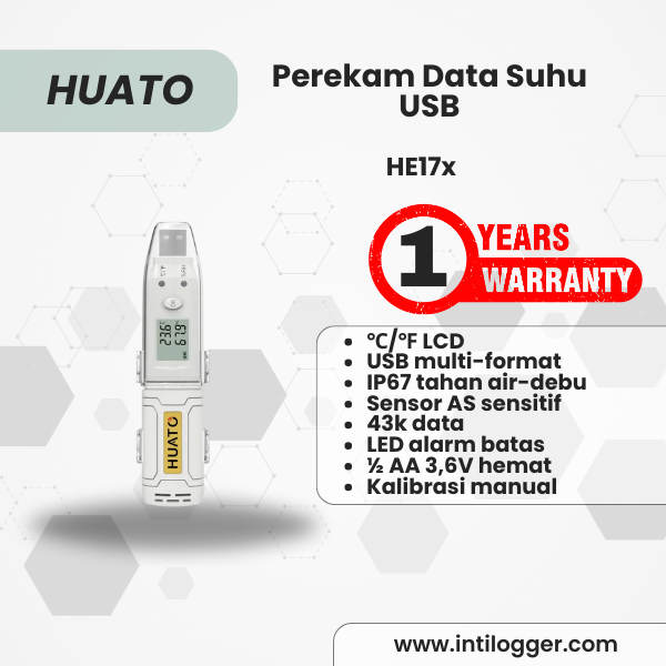 HE17X USB Temperature Data Logger dikembangkan oleh HUATO, dilengkapi layar LCD, desain elegan dan kompak, tahan air dan debu sesuai standar IP67, beberapa tingkat akurasi, indikator baterai, serta antarmuka USB.