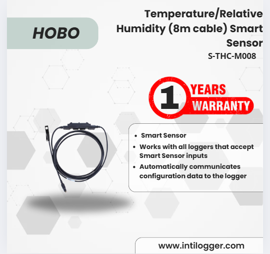 Sensor suhu dan kelembaban relatif dengan kabel sepanjang 8 meter, dirancang kompatibel dengan semua data logger HOBO yang mendukung Smart Sensors.
