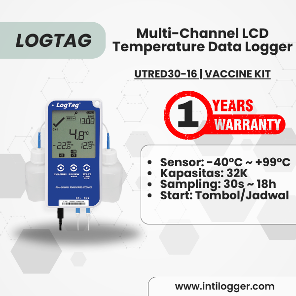 UTRED30-16 adalah data logger suhu dengan dua kanal dan probe eksternal (hingga 2), mencatat total 32.000 data (16.000 per kanal) dalam rentang -40°C hingga +99°C. Akurasi pembacaan hingga ±0,5°C dan resolusi 0,1°C. Mendukung 6 alarm per kanal, interval logging 30 detik–18 jam, serta tampilan LCD statistik harian hingga 30 hari. Daya tahan baterai AAA hingga 12 bulan, dengan opsi catu daya USB. Kompatibel dengan semua probe ST100 (tidak mendukung ST10), dan cocok untuk pemantauan suhu ganda yang presisi seperti vaksin atau laboratorium.