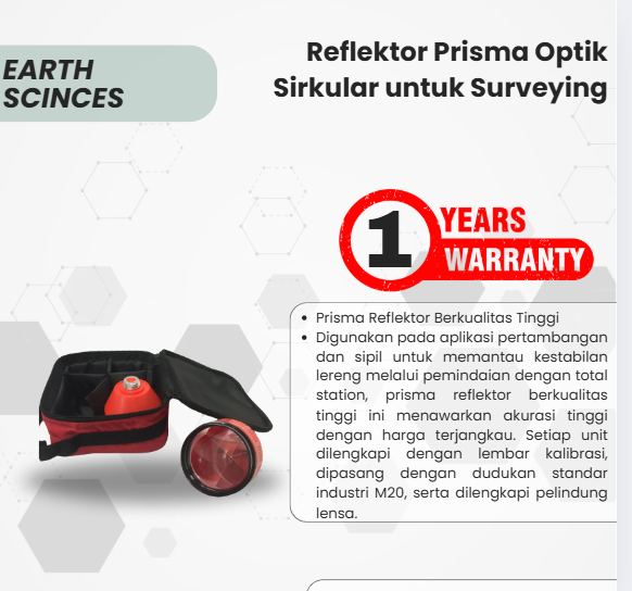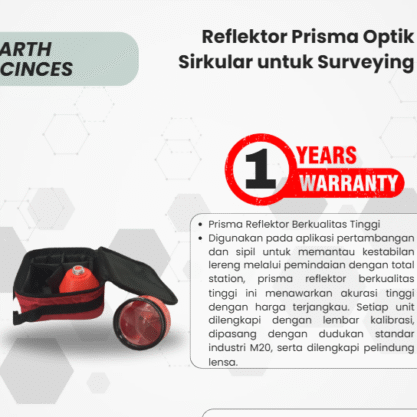 Prisma Reflektor Berkualitas Tinggi Digunakan pada aplikasi pertambangan dan sipil untuk memantau kestabilan lereng melalui pemindaian dengan total station, prisma reflektor berkualitas tinggi ini menawarkan akurasi tinggi dengan harga terjangkau. Setiap unit dilengkapi dengan lembar kalibrasi, dipasang dengan dudukan standar industri M20, serta dilengkapi pelindung lensa.