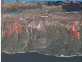 Di seberang teluk terdapat Nordnesfjellet. Di lereng gunung itu terletak Jettan, sebuah area pegunungan yang tidak stabil dengan ukuran sekitar 350 meter lebar dan 400 meter panjang, serta mengandung sebelas juta meter kubik batuan. (Lihat Gambar 1.) Jettan kemungkinan merupakan gunung paling dijaga ketat di dunia.